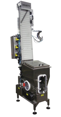 The basic function of the Waterfall Sorter is to orient a bottle closure and discharge it to a transfer system – generally a chute. Closures are trickled through a hopper onto a horizontal section of cleated belt. Oriented closures continue to travel up the elevator to where they are pushed and stripped sideways off of the cleated belt into a discharge area. From here the caps are transferred by a chute to where they are applied to a container.